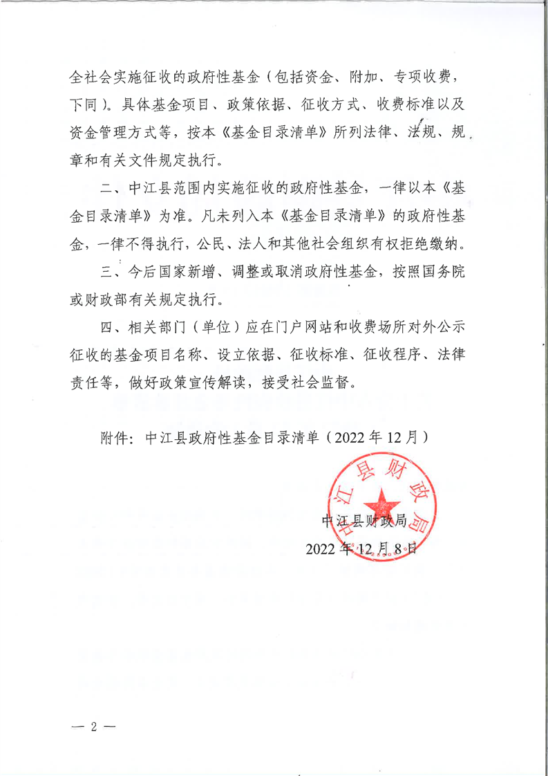 中江县 财政 公布 县政府 基金 清单 2022 12 的通知